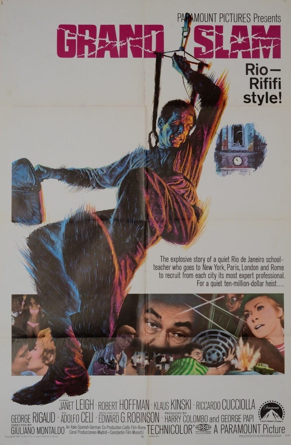 Although director Giuliano Montaldo (Machine Gun McCain, 1969) tosses in a few Hitchockian moments, these are never long-drawn-out in the manner of the master, because there’s never any let-up in the suspense and therefore to do otherwise would be to indulge himself. If there is boldness it’s in the muted tone. The marquee names – Edward G. Robinson (The Biggest Bundle of Them All, 1968), Janet Leigh (The Manchurian Candidate, 1962) and Adolfo Celi (Danger: Diabolik, 1968) – are all low-key, non-intrusive…