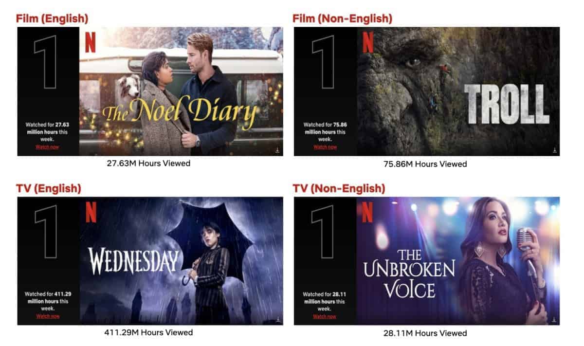 ‘Tis the season for holiday films on the English Films List, including The Noel Diary coming in at #1 with 27.63M hours viewed, Christmas on Mistletoe Farm with 11.11M hours viewed, Falling for Christmas with 9.08M hours viewed and Scrooge: A Christmas Carol with 8.17M hours viewed. Based on a true story, The Swimmers landed in the #2 spot with 27.04M hours viewed. Fans fell in love with Emma Corrin and Jack O’Connell in Lady Chatterley’s Lover. The romantic drama debuted on the list with 20M hours viewed. Jason Momoa’s Slumberland is what dreams are made of. The family fantasy had 17.83M hours viewed. Ghislaine Maxwell: Filthy Rich closed out the list with 7.61M hours viewed.